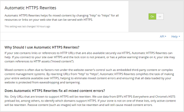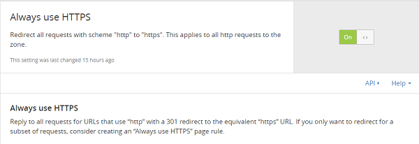 If you don’t want to have whole site over https, but only some parts of URL, like example.com/wp-admin, example.com/wp-login.php or example.com/section leave this option Off, and setup redirection to https for those pages either on your web server or in Page Rules page on your Cloudflare account.