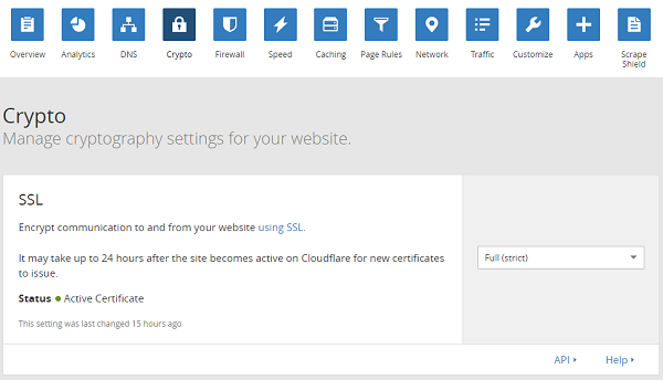 To enable your site being served over HTTPS from Cloudflare, login to your Cloudflare account, select domain you want to enable SSL on and click on the Crypto page with lock icon, to manage cryptography settings for your website.